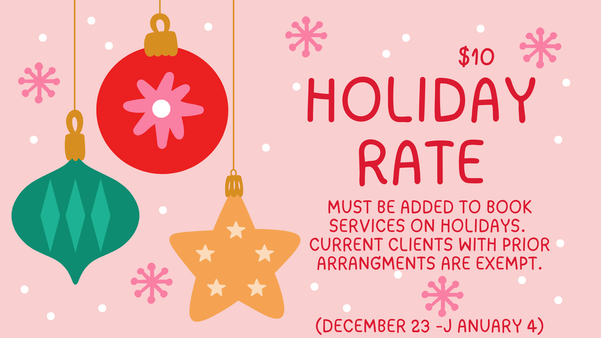 Holiday bookings include an additional charge because demand is higher and scheduling is tighter. Holiday rates apply on major holidays and select peak days. Current clients get special pricing and holiday rates may not apply. Make sure you become a client before peak rate times!!!