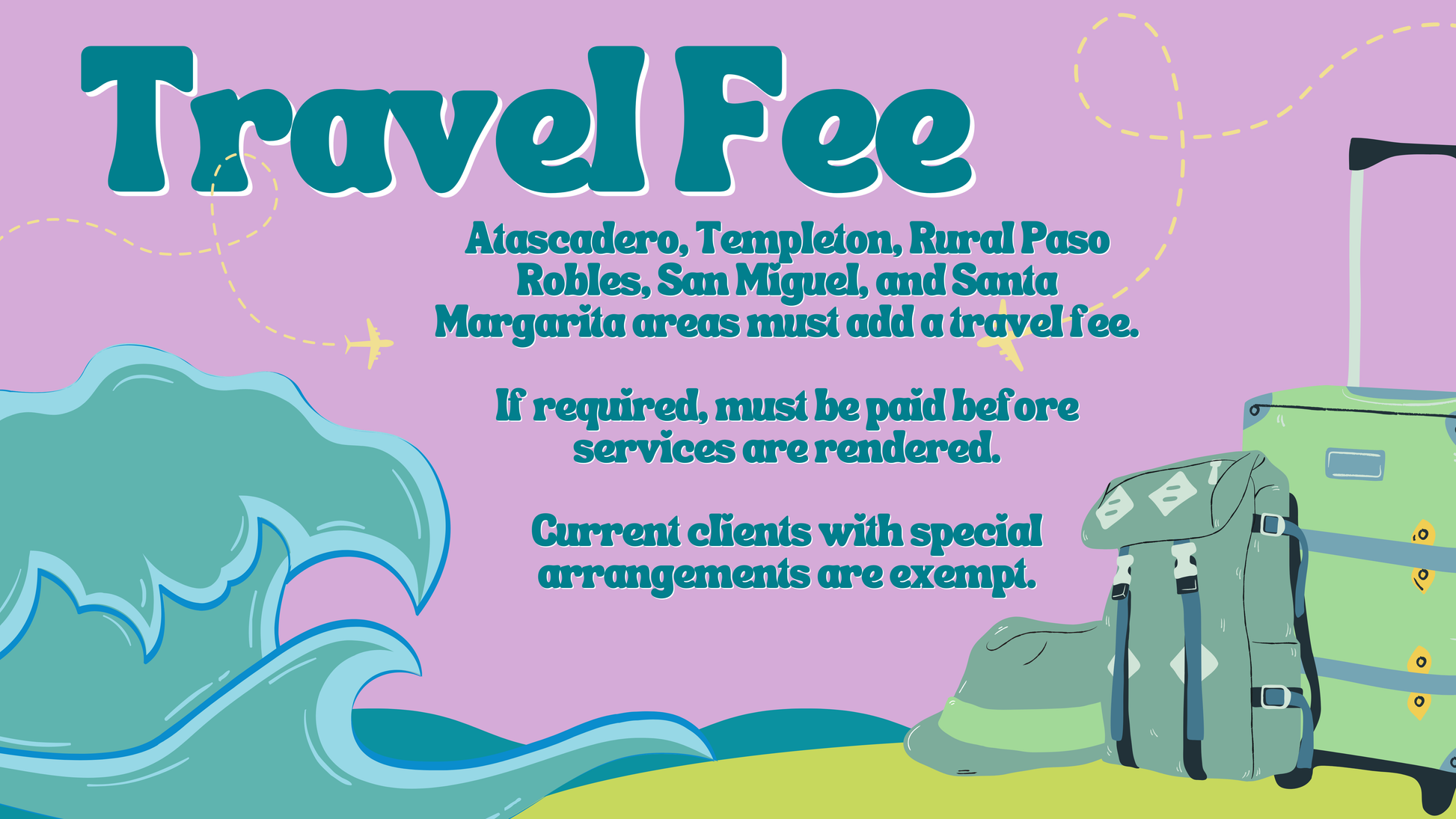 Anything outside the Paso Robles city limit must have a travel fee included in your first visit-we can chat about if it's needed moving forward. If you are rural Paso Robles you will be charged a travel fee if you do not add one yourself-you know if you're way out there.